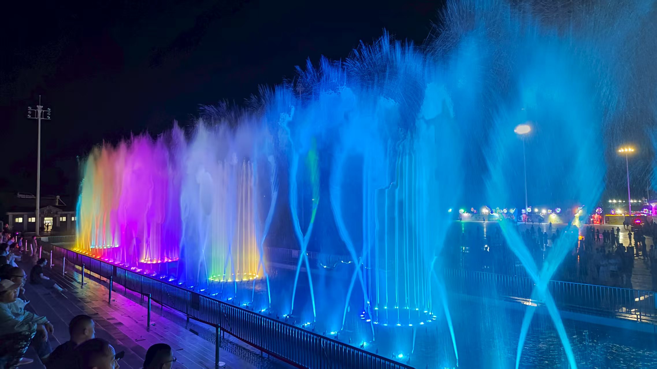 最后一縷水絲落下時,《全是愛》的余韻還在廣場上空盤旋。穿校服的少年低頭翻看錄像,屏幕里的水幕還在閃爍;賣熒光棒的小販數著今天的收入,嘴角沾著點糖霜;穿漢服的姑娘對著水洼整理鬢角,倒影里的燈影還在輕輕搖晃。孩子們已經奔向北側的娛樂區,海盜船的尖叫聲、旋轉木馬的音樂聲、彩虹滑梯上的歡笑聲,和殘留的水腥味混在一起,釀成興安區人民廣場夏夜最醇厚的酒。