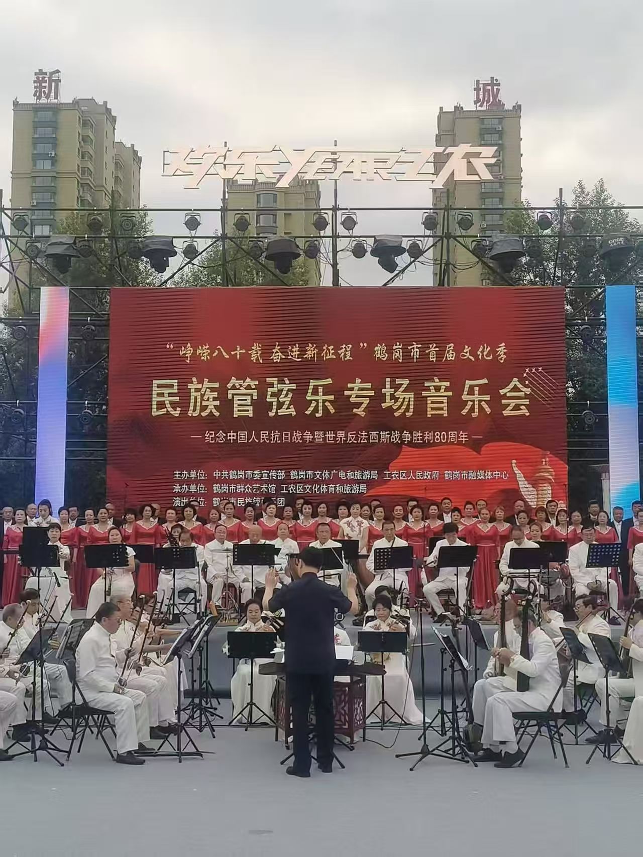 8月25日下午5點,鶴崗市天水湖畔荷香飄送,秋風拂面,湛藍的湖水在夕陽下熠熠生輝 ,鶴崗民族管弦樂專場音樂會拉開帷幕,演奏員以恢宏的民族音樂語言再現抗戰時期波瀾壯闊的歷史,點燃人們的愛國熱情。